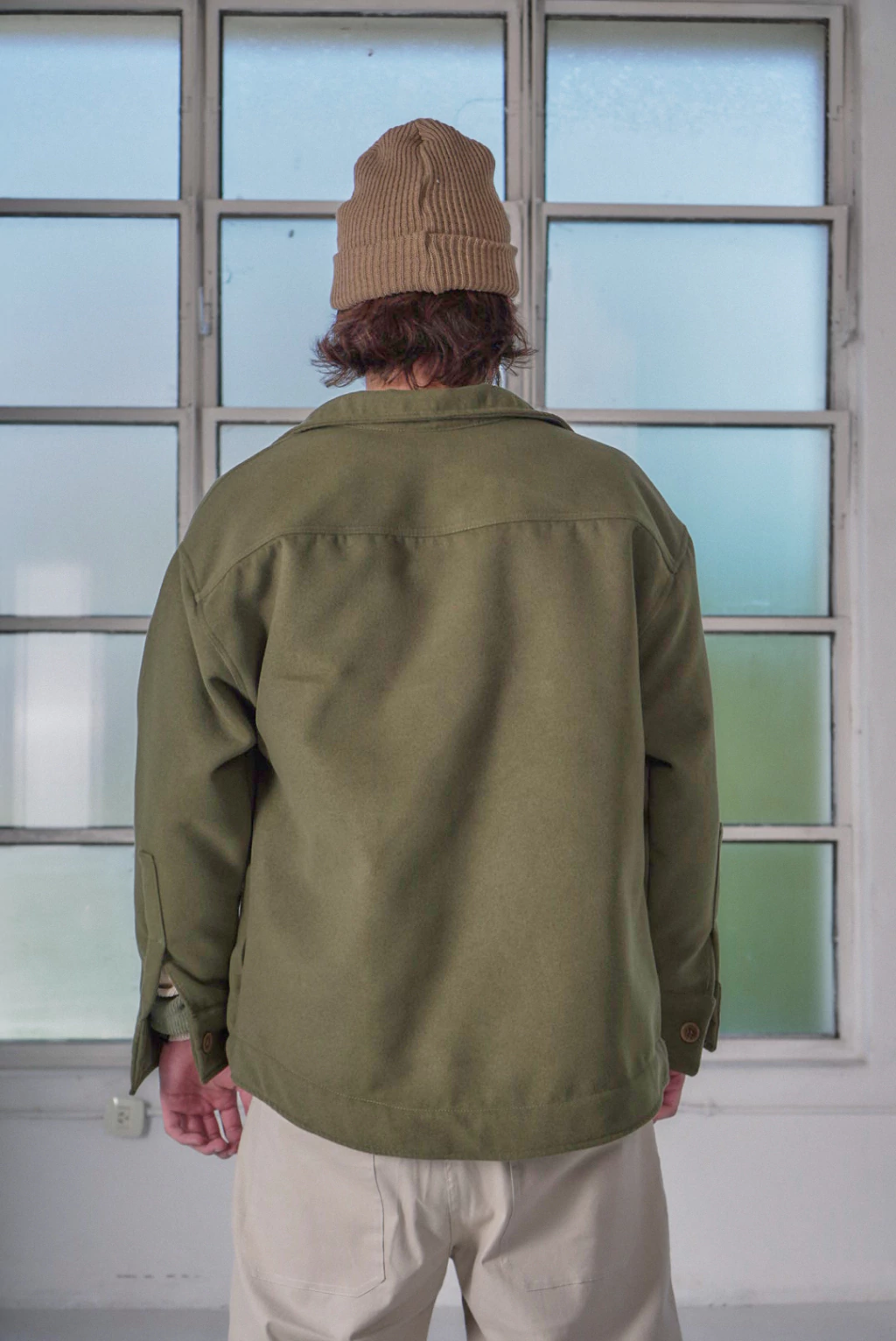 Oversize. Ancho de hombres caído y mangas anchas. 2 bolsillos laterales, 2 frontales.